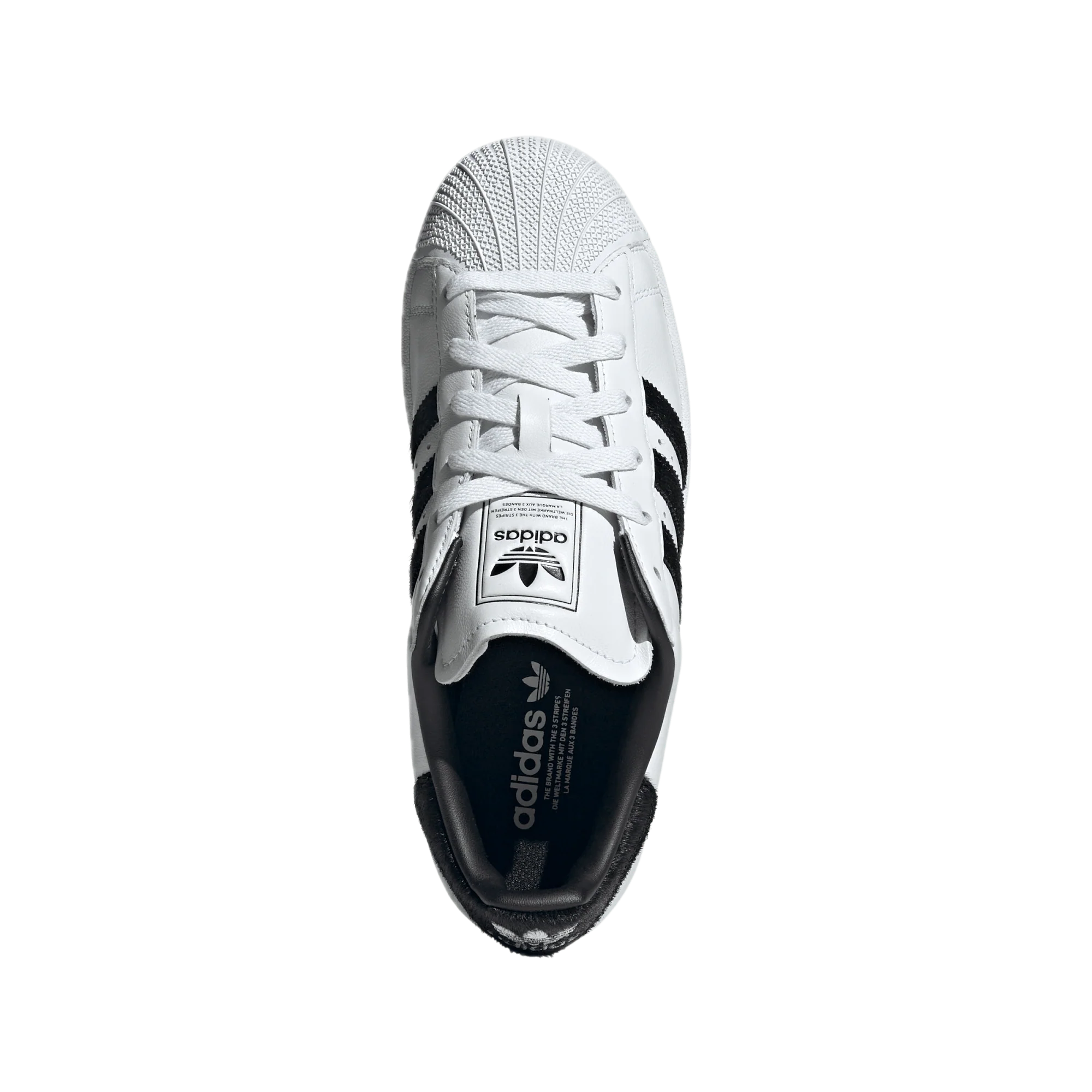 Klasyczne połączenie bieli i czerni zostało wzbogacone o cholewkę z pony hair, która nadaje sneakersom luksusowy, teksturalny charakter. Kontrastowe trzy paski oraz kultowy gumowy shell toe podkreślają dziedzictwo modelu, jednocześnie nadając mu świeżego, fashion-forward wyrazu.