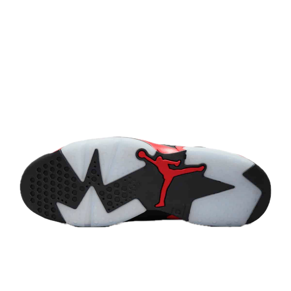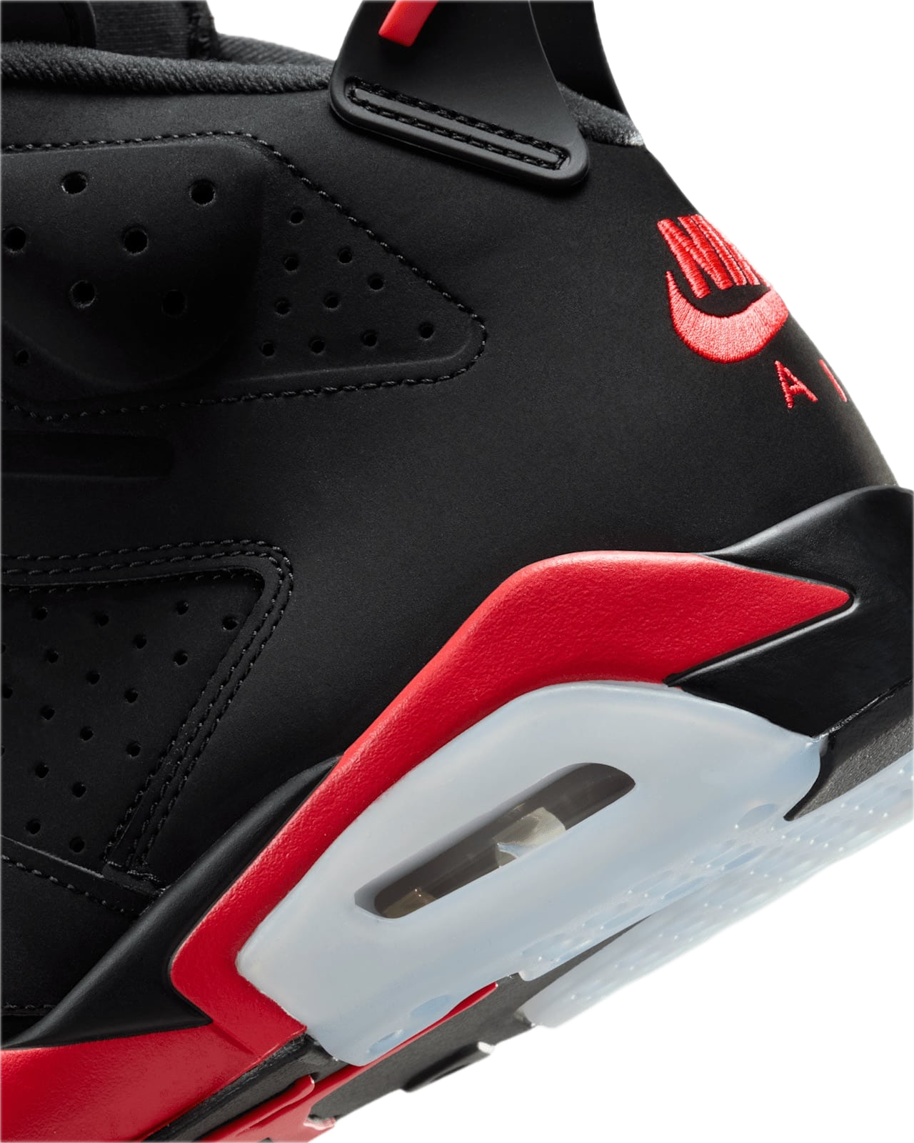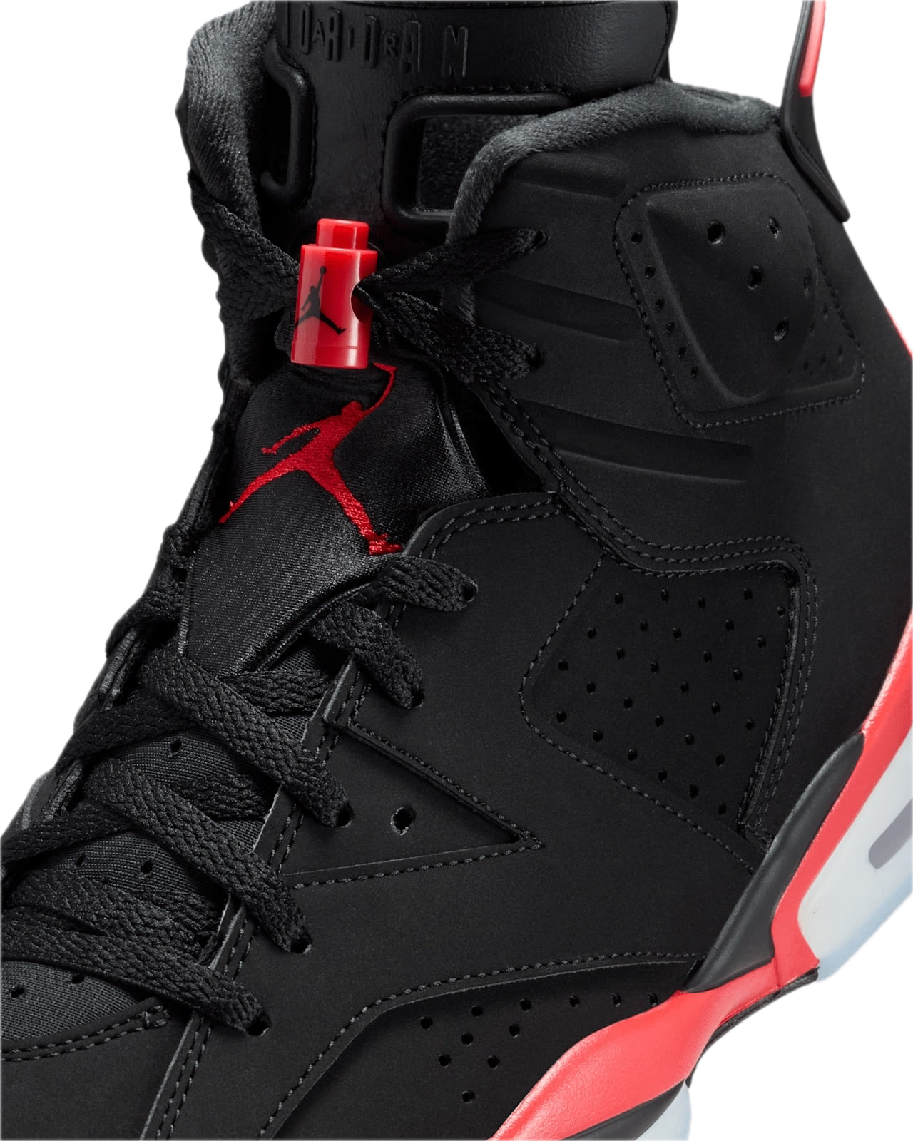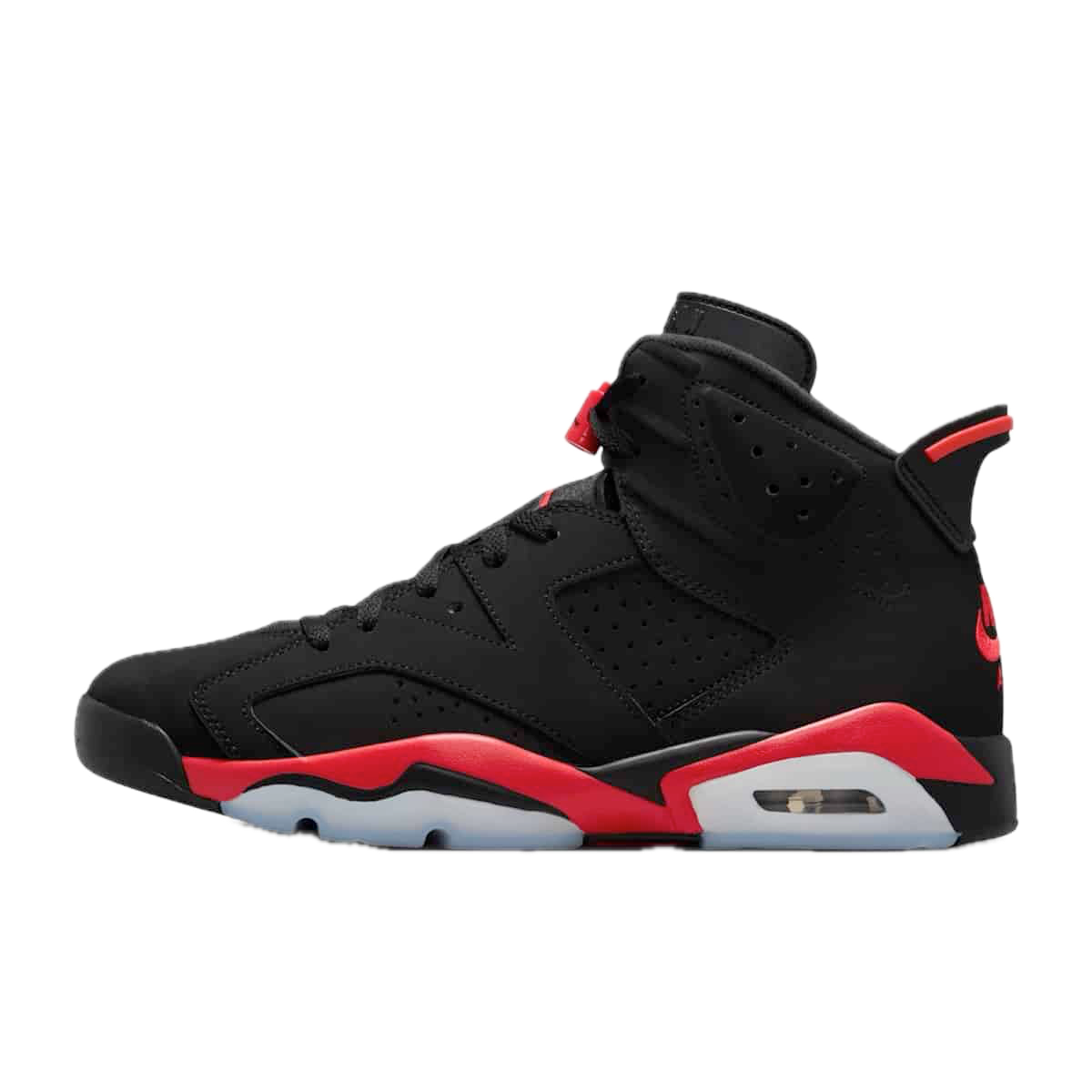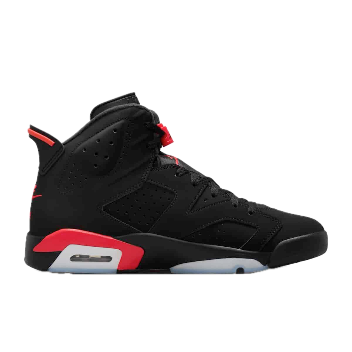 Model bazuje na legendarnej kolorystyce Infrared, łączącej głęboką czerń z charakterystycznymi czerwonymi akcentami. Dynamiczna sylwetka Air Jordan 6 z perforowaną cholewką, widocznymi panelami oraz sportowymi detalami podkreśla koszykarskie dziedzictwo modelu i jego wyjątkowy charakter.