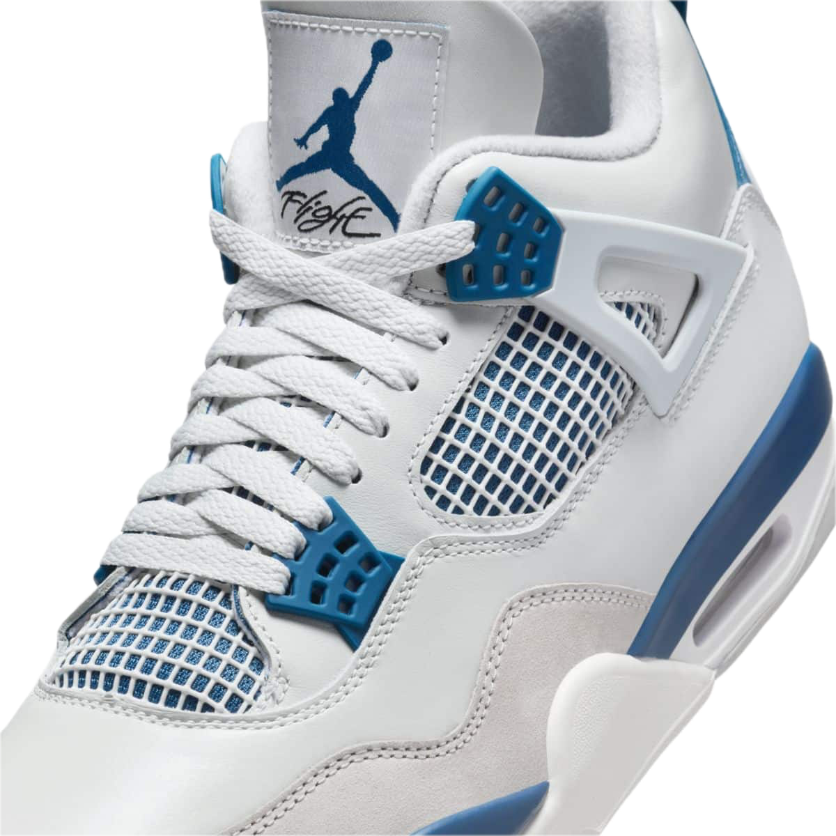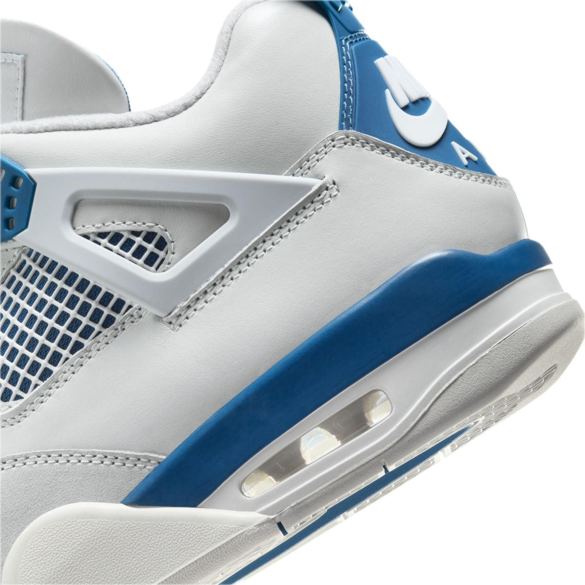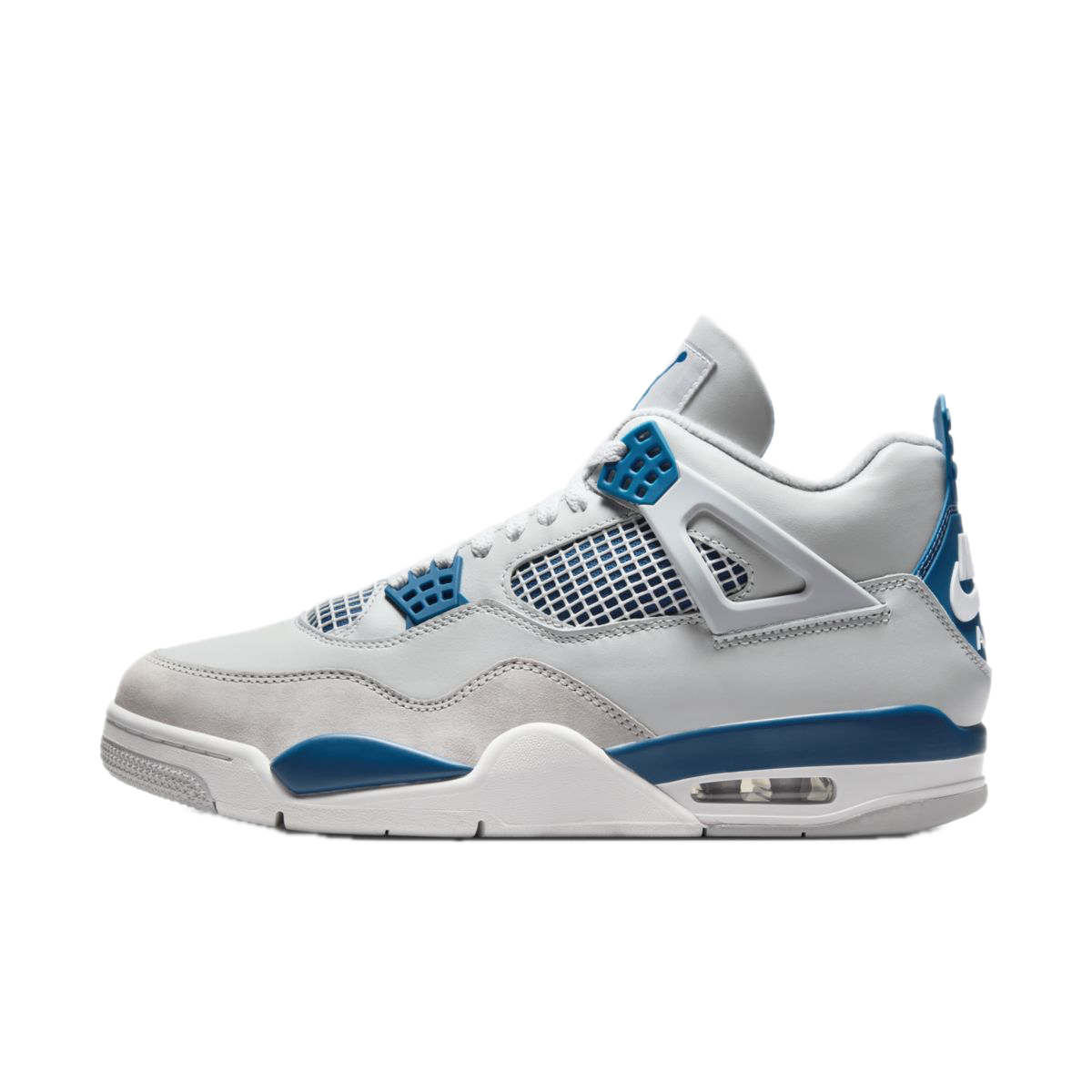 Czysta biała cholewka została zestawiona z charakterystycznymi akcentami Military Blue oraz szarymi, „cementowymi” detalami. Klasyczna paleta barw podkreśla ikoniczną konstrukcję AJ4, tworząc świeży, sportowy wygląd, który pozostaje aktualny niezależnie od trendów.