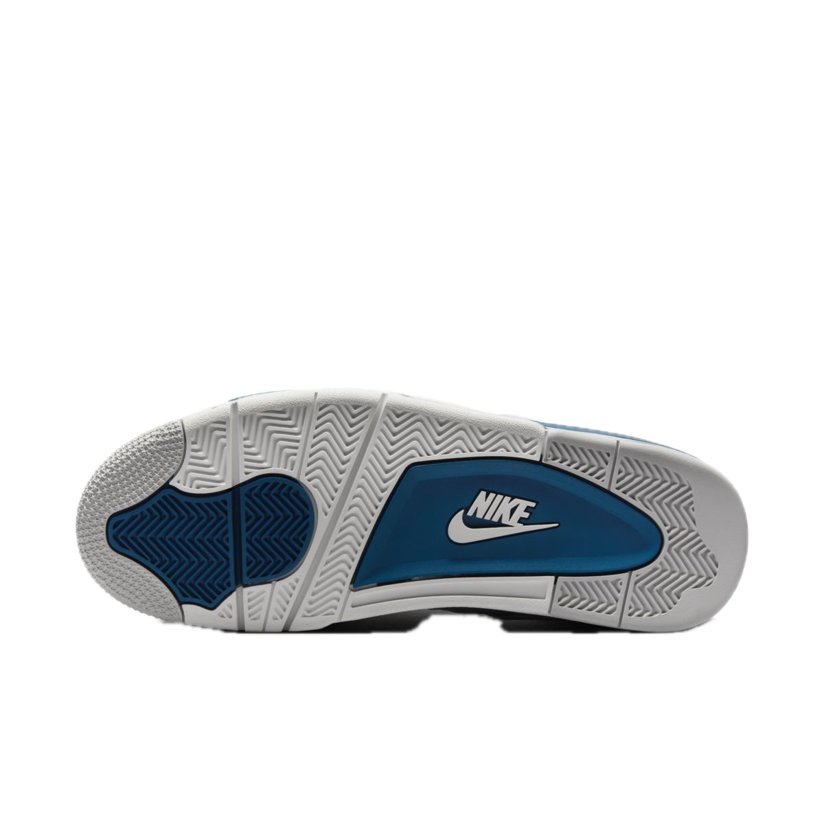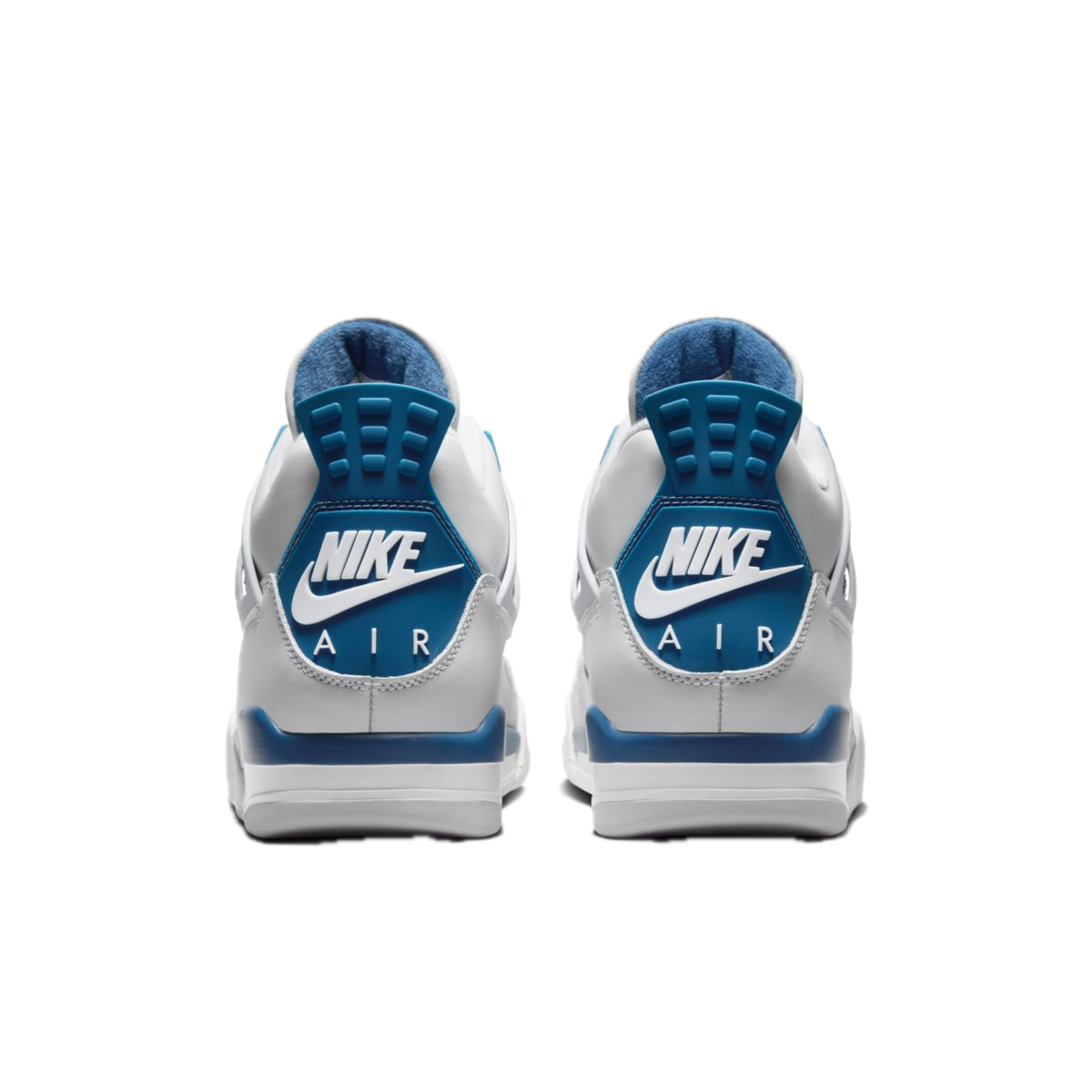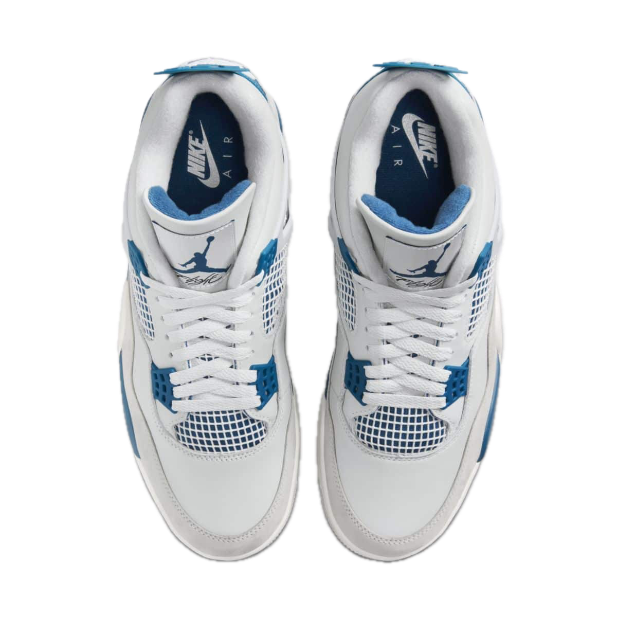 Czysta biała cholewka została zestawiona z charakterystycznymi akcentami Military Blue oraz szarymi, „cementowymi” detalami. Klasyczna paleta barw podkreśla ikoniczną konstrukcję AJ4, tworząc świeży, sportowy wygląd, który pozostaje aktualny niezależnie od trendów.
